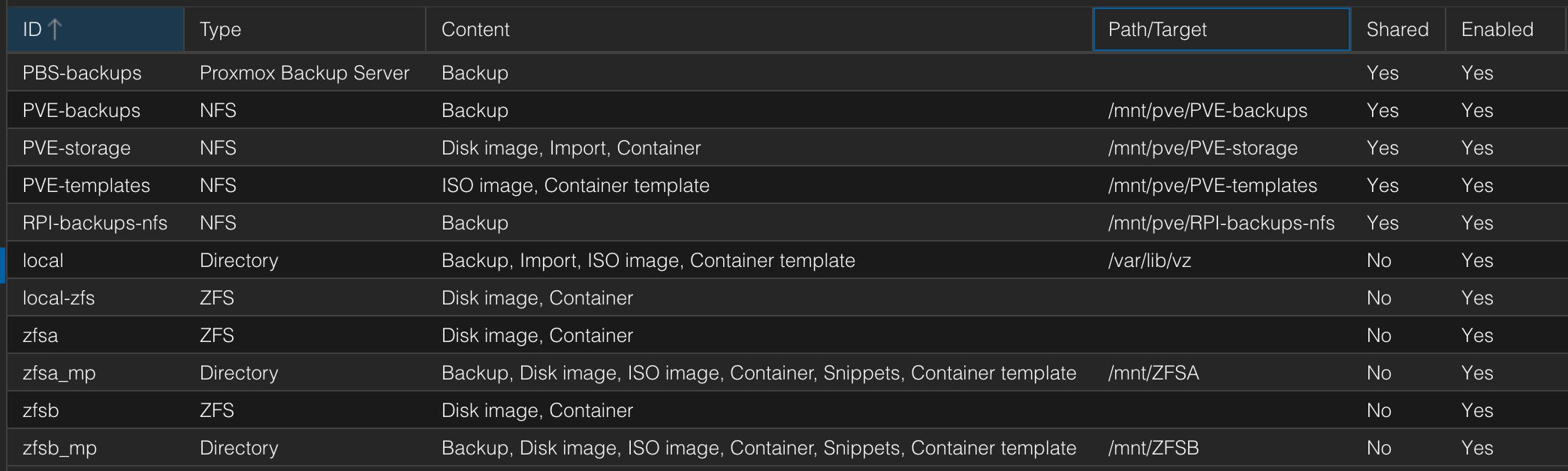 The table above shows the storage configuration for our Staging Cluster Nodes. PVE-Storage is implemented on our high-availability NAS.